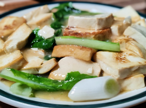老王的店里沒有什么菜單,能吃上什么菜全看老王當(dāng)天采購食材時相中了什么菜;老王的菜也沒有什么復(fù)雜技法和調(diào)料,憑著一鍋熬好的老湯和傳統(tǒng)燒制技藝,在濃濃的煙火中藏著最地道的家常滋味。紅燒大腸是鎮(zhèn)店招牌,清洗、焯水、鹵制層層把關(guān),爆炒后色澤油亮,軟糯中帶著嚼勁,醇厚香氣勾得人直咽口水;醋溜綠豆芽看似簡單,花椒炸香、熱油快炒,醋香與豆芽的清甜碰撞,爽脆可口;麻婆豆腐嫩而不散,紅油鮮亮,麻辣鮮香在舌尖炸開;炒面更是一絕,顛鍋翻炒間,每根面條都裹滿醬汁,配上脆脆的綠豆芽,噴香撲鼻;老式雞蛋湯則暖到人心坎,蛋花嫩滑,蝦皮提鮮,一口下去,渾身舒坦。最受歡迎的餃子,從搟皮到調(diào)餡全是老王愛人親手操作,豬肉大蔥餡料鮮香十足,煮好的餃子不好看卻飽滿圓潤,蘸上特制料汁,滿是家的味道。