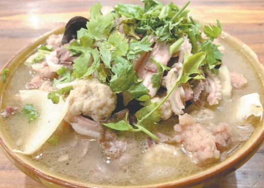 制作時,先將后腿肉切成薄片,在油鍋中炸1分鐘撈出備用。這便是油炸小酥肉,外焦里嫩的口感讓人回味無窮。油炸酥肉丸子也別具特色,選用牛肋條切成肉丁,1:1的肉和淀粉摻入雞蛋,用祖?zhèn)飨懔吓浞奖P餡,炸好后當(dāng)天備用。咬上一口,酥脆與鮮香在口中交織。水煮牛肉則選用前膀、脖肉切成塊狀,放至加入香辛料的水鍋中煮熟,撈出切成肉片,肉質(zhì)鮮嫩,入口即化。水汆丸子的制作更精細(xì),用里外脊切成碎肉,紅薯粉用水調(diào)好,打入雞蛋清,放入懷姜、秘制香辛料等食材攪拌成餡,鍋中燒水,用手?jǐn)D出丸子氽入開水中,煮15分鐘至丸子浮上水面即可撈出,Q彈爽滑的口感令人贊不絕口。而老湯,是景亮雜拌的靈魂所在。將煮牛肉的鮮湯加牛骨再次熬制,用這濃郁醇厚的老湯燴制所有食材,做出的雜拌鮮香可口,過癮解饞,難怪有“一碗雜拌一頭!钡拿雷u(yù)。