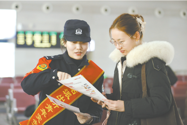 圖③ 民警在候車(chē)大廳為返鄉(xiāng)旅客普及安全知識(shí)。