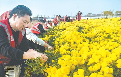 11月13日,志愿者在焦作市云臺山農(nóng)業(yè)科技有限公司的冰菊基地采摘冰菊。當天,修武縣總工會組織機關黨員干部、志愿者、勞模代表40余人,來到冰菊基地開展助農(nóng)采菊志愿服務活動。在基地技術人員的指導下,他們嚴格按照采摘標準,彎腰分揀、細心采摘、有序裝袋,田間地頭呈現(xiàn)出一派熱火朝天的勞動景象。