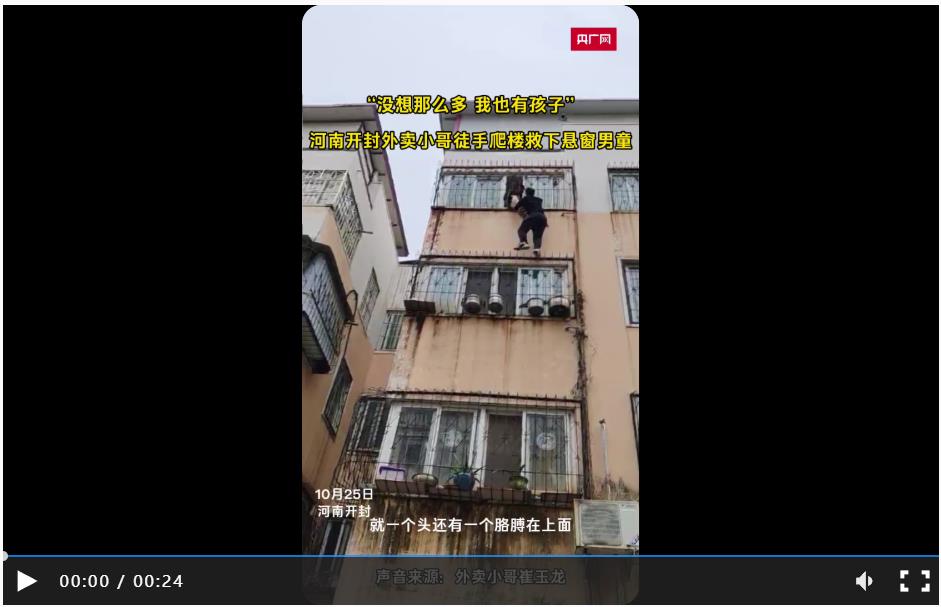 10月25日12時(shí)40分許,在開(kāi)封市龍亭區(qū)北郊鄉(xiāng)大宏世紀(jì)新城,一名男童在家中玩耍時(shí)不慎跌落至4樓窗戶(hù)外,正在附近配送外賣(mài)的崔玉龍徒手爬上四樓護(hù)欄,成功營(yíng)救了該男童。對(duì)此,網(wǎng)友紛紛為這份“平凡人的勇敢”點(diǎn)贊。