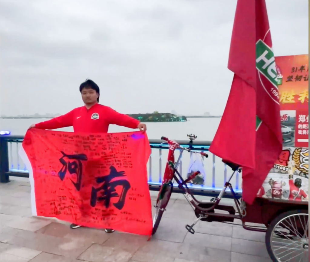 靠著一輛插滿球迷簽名隊(duì)旗的三輪車