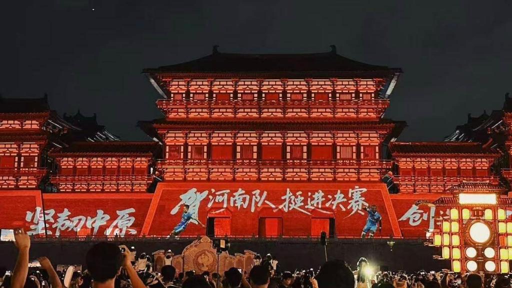 △圖為洛陽應(yīng)天門為河南隊(duì)首次進(jìn)入足協(xié)杯決賽推出的應(yīng)援燈光秀