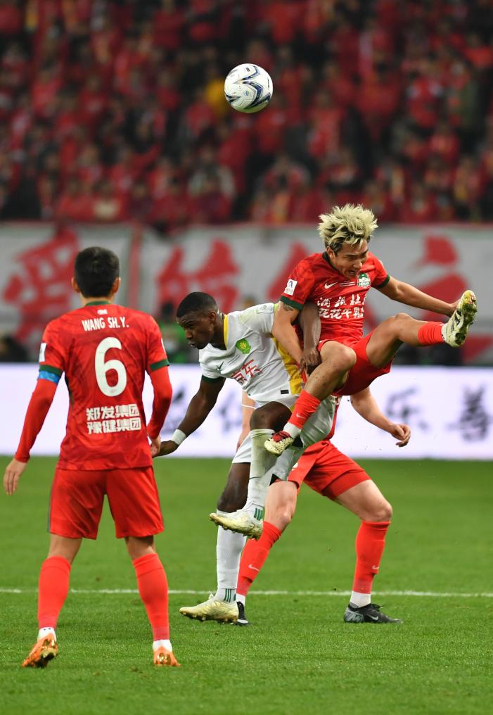 △12月6日,在2025中國足球協(xié)會杯決賽中,河南隊(duì)球員黃銳烽(右)爭搶頭球。新華社記者 李嘉南 攝