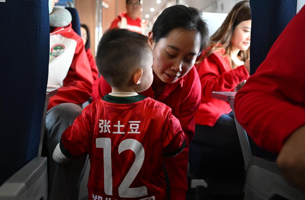 △12月6日,小球迷在列車上準(zhǔn)備去看球。新華社記者 李嘉南 攝