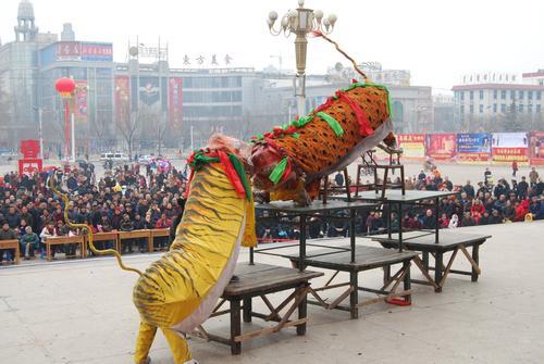 常家武虎是流傳在東馮封村的一種傳統(tǒng)民間舞蹈,由常氏第九世祖常一顯、常一貴創(chuàng)編而成。明朝萬(wàn)歷年間,常一顯、常一貴從老虎的騰、跳、撲、臥中受到啟發(fā),創(chuàng)編了武虎這一民間舞蹈,歷經(jīng)數(shù)百年30余代,久傳不衰。常家武虎的表演主要由地虎、山虎和儀仗隊(duì)組成。地虎的表演是在儀仗聲中由武虎先行入場(chǎng),臥于場(chǎng)中,后在鞭炮聲中驚醒,打虎者隨之入場(chǎng)逗引并與之搏斗。武式、虎威交相呼應(yīng),鼓聲、人聲吶喊助威,形成了一套完整的舞蹈表演套路。山虎表演是場(chǎng)中設(shè)一兩層桌子和一把圈椅疊成的山形高臺(tái),鞭炮、鼓樂(lè)聲中,打虎者和一裝扮成狗熊者先行入場(chǎng),逗引武虎爆跳、騰挪、撲咬,或臥或立,或急或慢繞場(chǎng)表演。人展武勢(shì),虎壯虎威,熊戲熊姿,場(chǎng)面宏大、熱烈,具有強(qiáng)烈的震撼力和觀賞性。2014年12月,常家武虎被國(guó)務(wù)院公布為第四批國(guó)家級(jí)非物質(zhì)文化遺產(chǎn)。