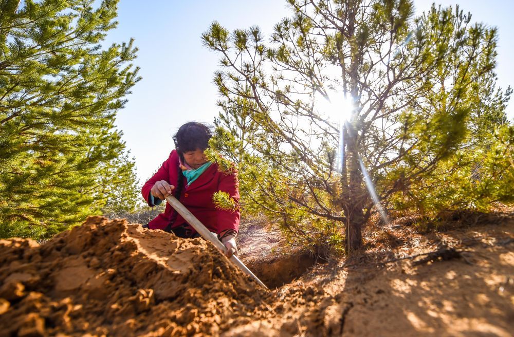 2021年3月23日,殷玉珍在內(nèi)蒙古毛烏素沙漠挖土,查看松樹根部的生長情況。20世紀80年代,殷玉珍嫁到這片沙地時,眼前只有漫無邊際的黃沙。1986年,她埋下第一棵樹苗,從此與風(fēng)沙較勁。如今,7萬多畝荒沙披上了綠裝,治理好的土地上種起了小米,金燦燦的谷穗成了“沙漠黃金”。