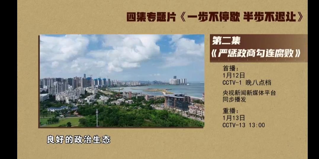 反對腐敗、建設(shè)廉潔政治,是我們黨一貫堅持的鮮明政治立場,是黨自我革命必須長期抓好的重大政治任務(wù)。要把嚴(yán)懲政商勾連腐敗作為攻堅戰(zhàn)重中之重,堅決打擊以權(quán)力為依托的資本逐利行為,堅決防止各種利益集團、權(quán)勢團體向政治領(lǐng)域滲透,不斷凈化政治生態(tài),推動構(gòu)建親清統(tǒng)一的新型政商關(guān)系,促進經(jīng)濟社會高質(zhì)量發(fā)展。電視專題片《一步不停歇 半步不退讓》第二集《嚴(yán)懲政商勾連腐敗》,講述紀(jì)檢監(jiān)察機關(guān)聚焦政治問題和經(jīng)濟問題交織的腐敗案件,嚴(yán)懲以商養(yǎng)官、以官護商、官商一體等問題,堅決破除政商勾連“利益共同體”?偱_央視綜合頻道1月12日晚8點檔播出,央視新聞新媒體平臺同步播發(fā)。
